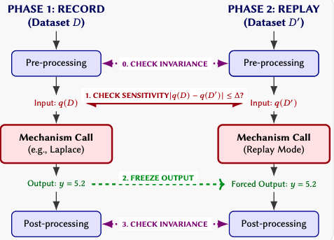 Re:cord-play checks this through a record-and-replay technique. Run the pipeline once on a dataset and record what each DP mechanism outputs. Freeze those outputs. Run the pipeline again on a neighbouring dataset—one that differs by a single individual. If anything in the control flow, parameter logic, or downstream behaviour diverges between the two runs, that divergence can only come from one place: data-dependent behaviour that should not exist.